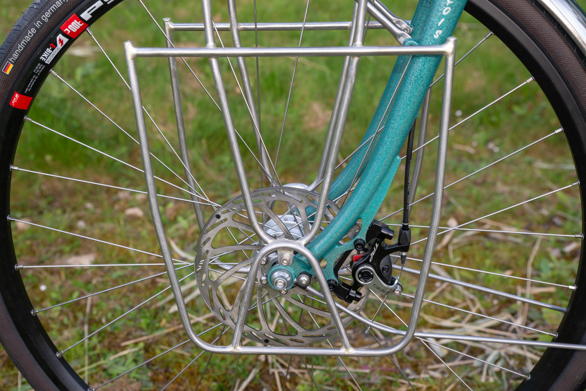 Dans un esprit de belle randonneuse vintage mais emprunte de modernité, elle construite en tube Reynolds 853, les composants font appel à des composants clasique de haute qualité et européens dans leur robe anodisés argent : moyeux Hope et Son , pédalier spécialités TA ...