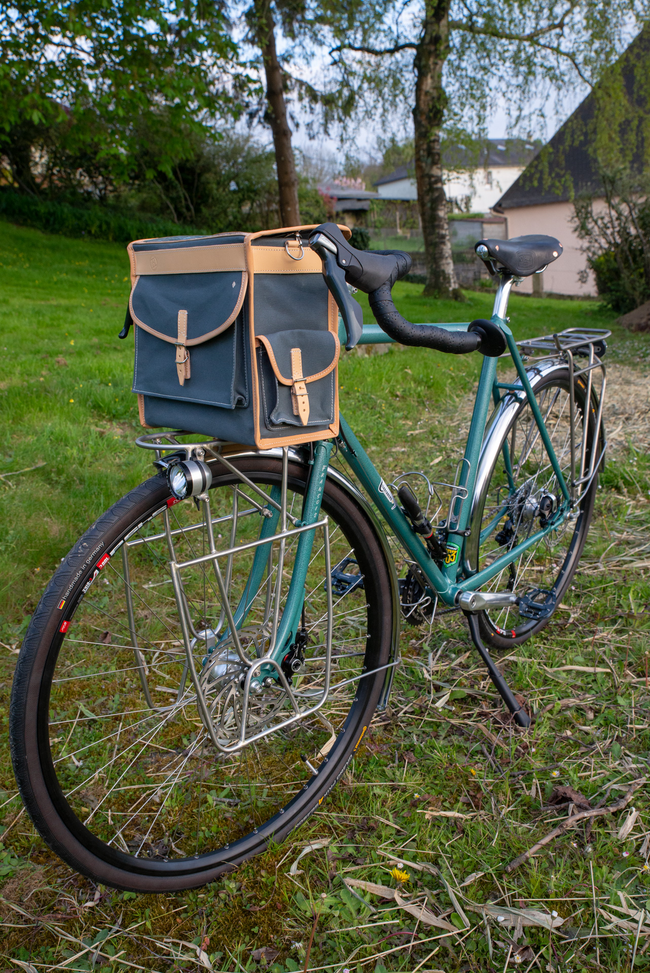 Les portes-bagages avant sont en tube inox fabriqués maison, joues latérales surbaissées démontables très facilement par 3 vis de chaque coté.Le porte-bagages arrière et un Tubus Cosmo en tube inox.