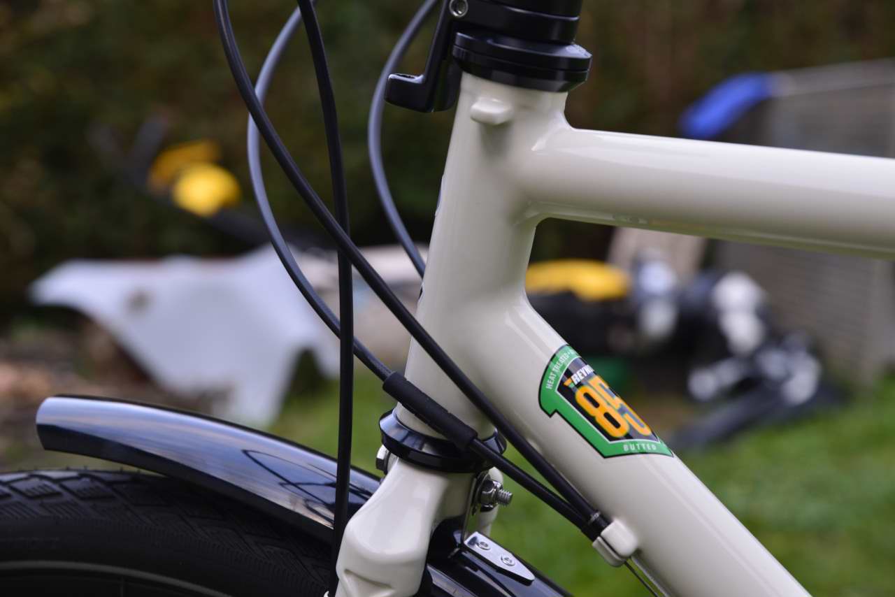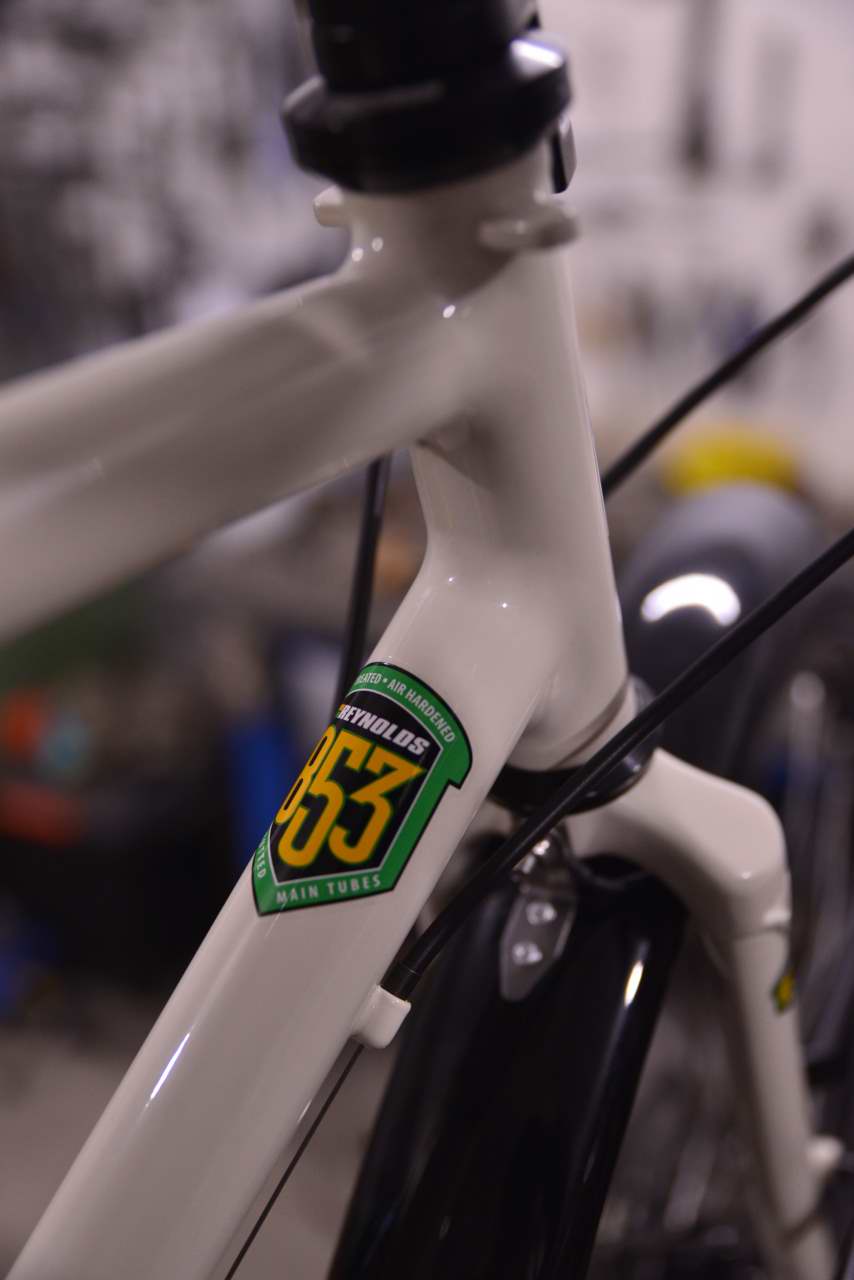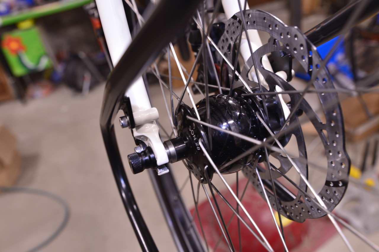 Cadre et fourche Reynolds 853. Tension de la courroie par excentrique au pédalier pour conserver la concentricité de la roue/garde-boue. Freins à disque double-came et commande par câbles. Roues montées main sur base Rohloff et Son , rayons Sapim et jantes Ryde. Le moyeu avant est un SON dynamo SL (sans connecteur), ne roulant pas de nuit, Gérard le destine à la charge de batteries uniquement (GPS, APN, téléphone ...)