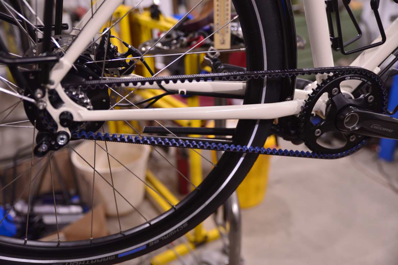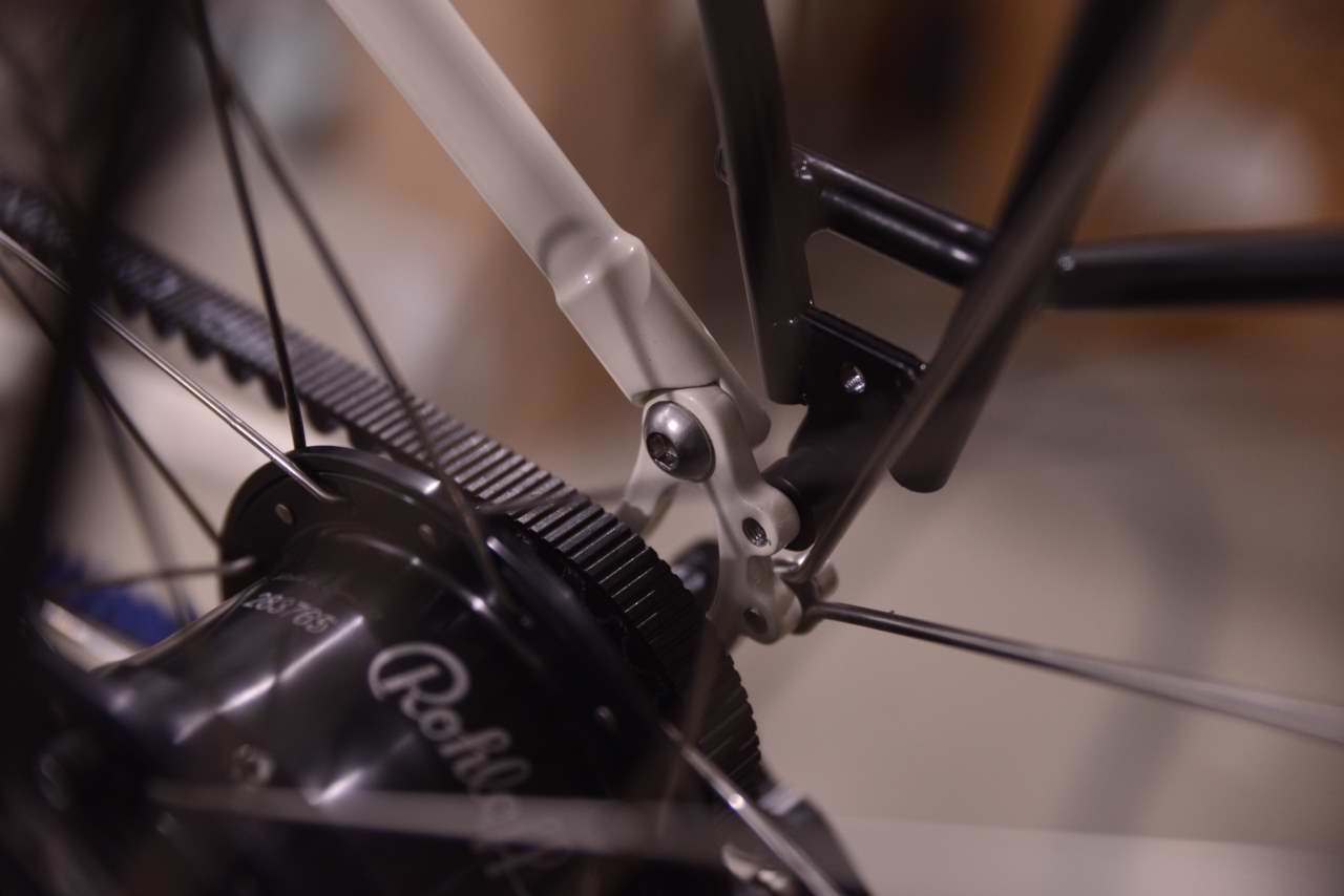 Transmission Rohloff avec courroie Carbon Gates, détail cadre ouvrable