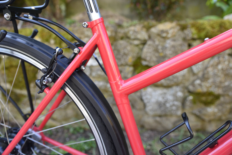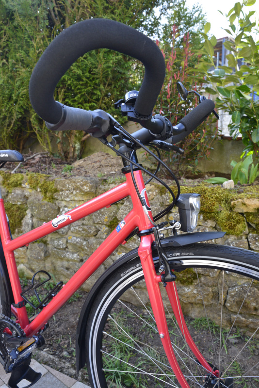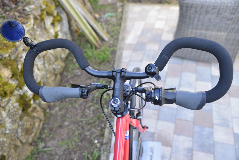 Nicole, souffrant d'arthrose au pouce gauche, ne pouvait plus utiliser les changements de vitesses classiques de son guidon plat. La position du guidon de course avec des leviers de freins combinés ne lui convenant pas, c'est un cintre papillon avec une poignée tournante Rohloff qui ont été adoptés pour conjuguer position confortable et manipulation aisée du changement de vitesse.