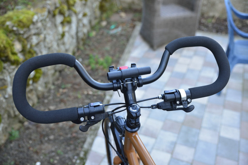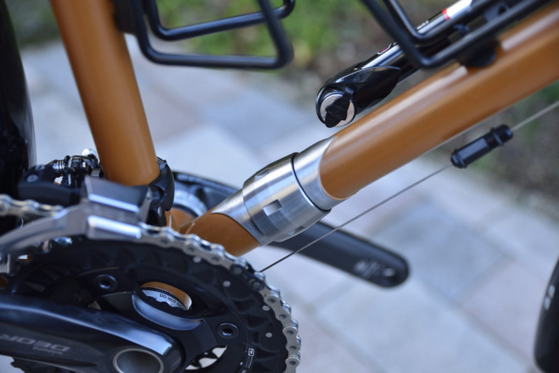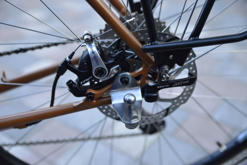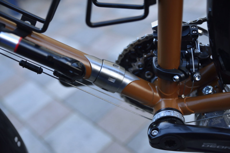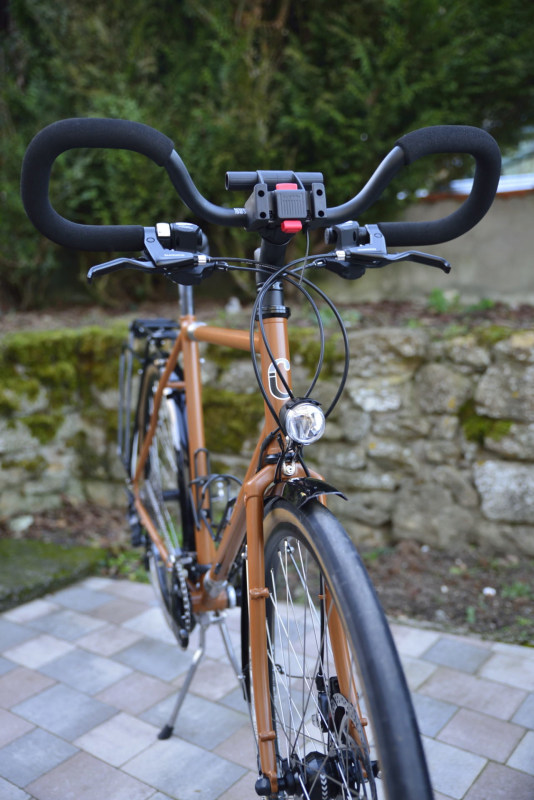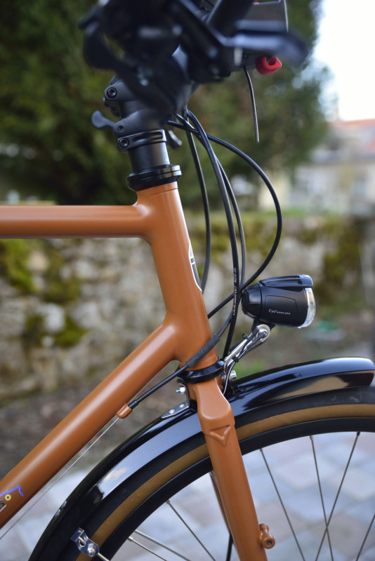 Cadre Reynolds 853 soudo-brasé, coupleurs inox S&S, roues montées main avec moyeu Hope à l'arrière et dynamo ShutterPrecison à l'avant, transmission triple deore Shimano , freins à disques TRP