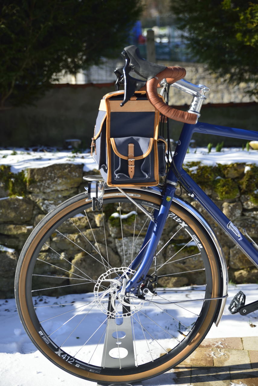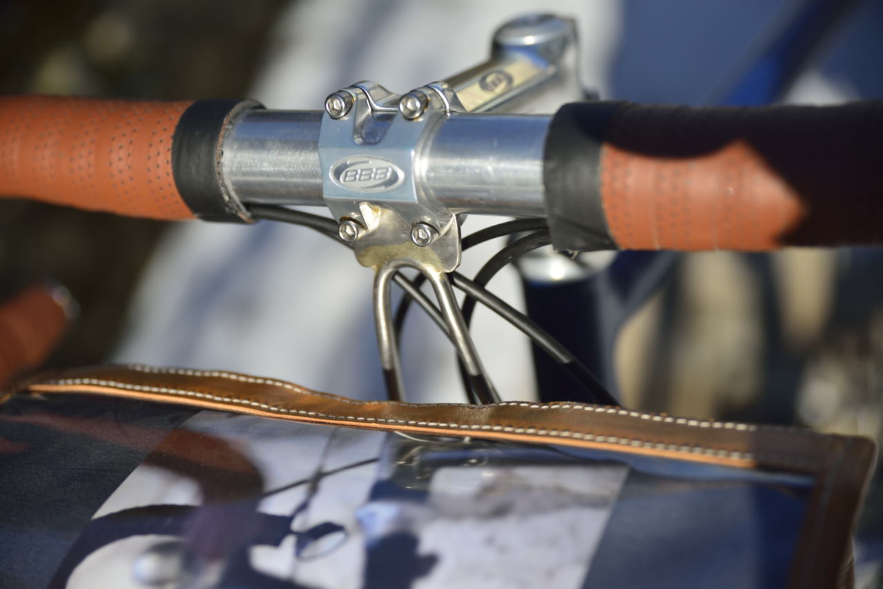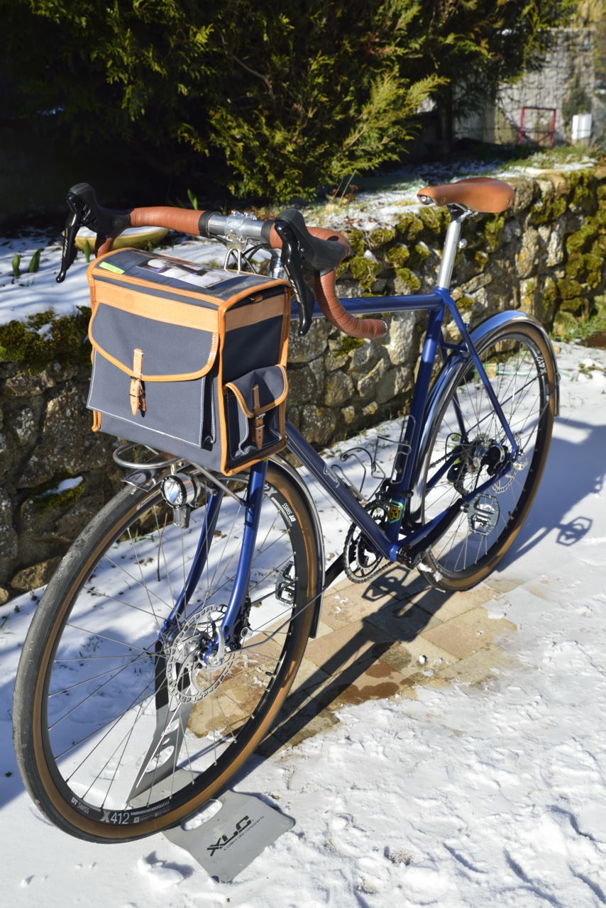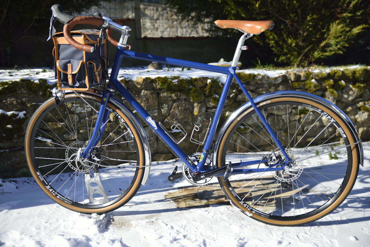 Celle que j'avais exposé au concours de machine et sur laquelle j'ai effectué dans les temps cette prestigieuse randonnée est en roue de 650B, mais vu la grande taille de Michel, nous avons opté pour des roues de 700C pour un visuel plus harmonieux. Des garde-boue en inox de chez Berthoud ont remplacé ceux en bois de chez Acanthe. Pour le reste il est en tout point identique aux braquets près.