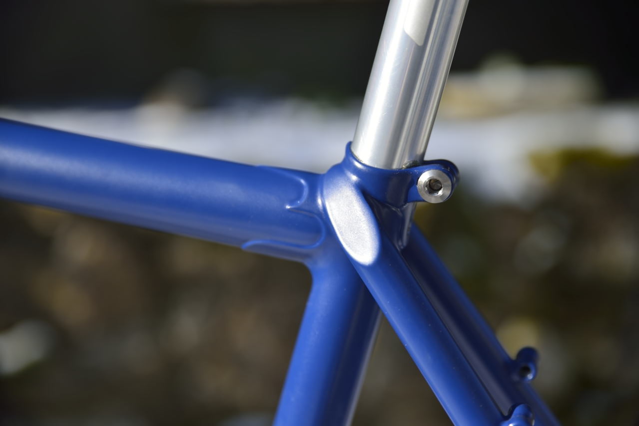 Cadre en Reynolds 853 à demi-raccords faits main et soudo-brasés , haubans "à plaquettes" façon vintage.