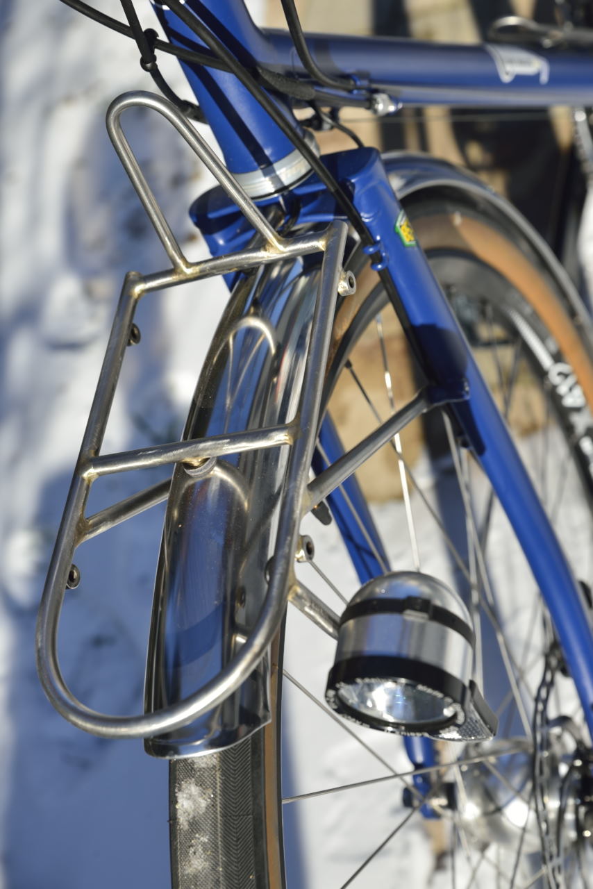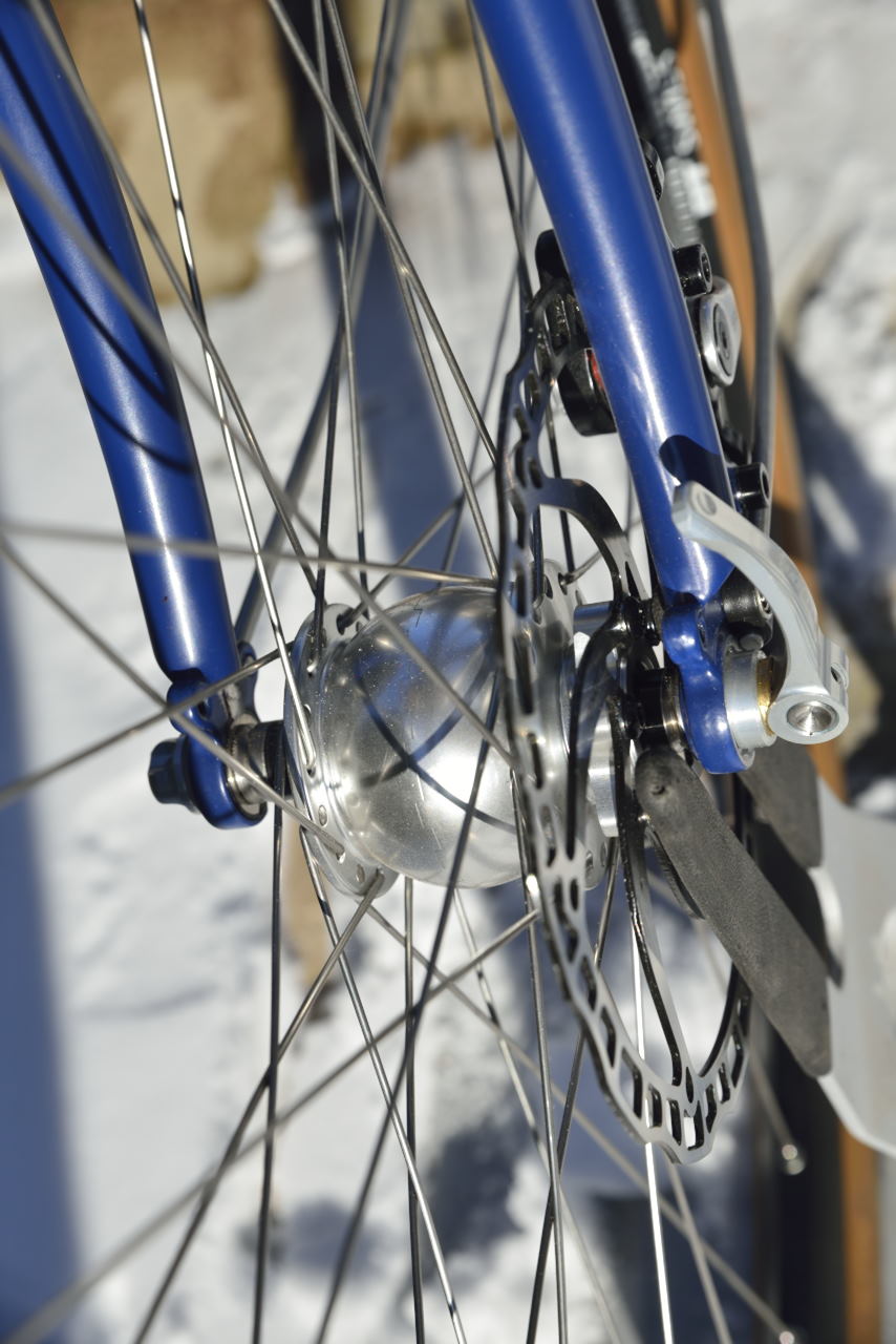 Roues montées main sur moyeux Hope Pro4. Transmission Shimano ultegra , manivelles IRD et plateaux TA, freins disques mécaniques TRP, éclairage par moyeu dynamo SON SL (sans fiches de connections) et phare et feu SON . Porte-sac et décaleur maison en tube inox. Selle et garde-boue Berthoud