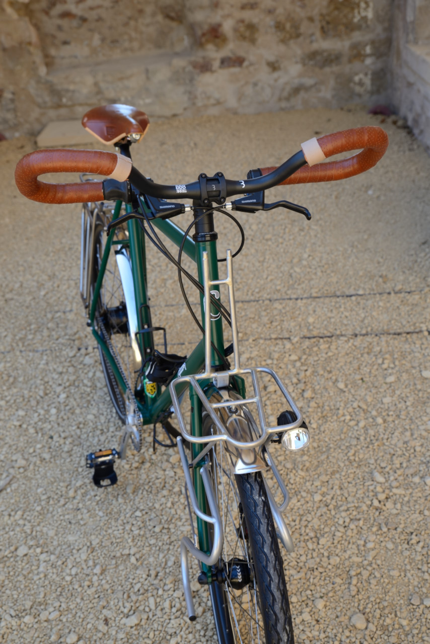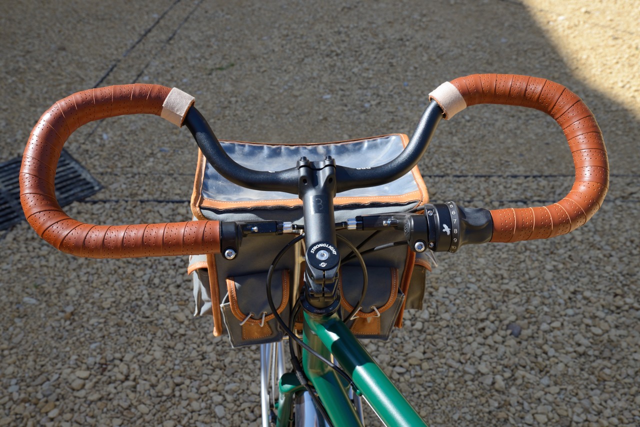 Le porte sac de guidon est fabriqué maison en tube inox et intègre la fixation pour la sacoche Berthoud.
