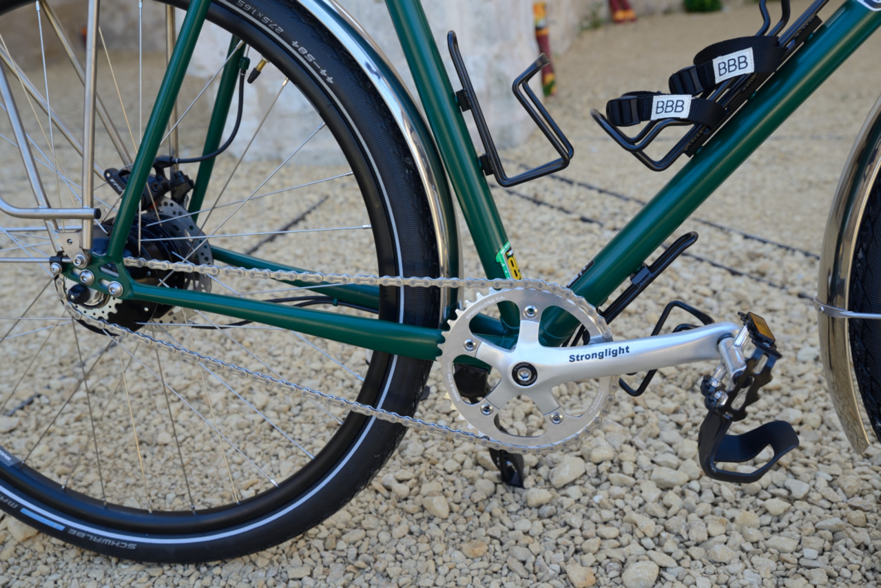 Hubert s'est plaisir pour sa nouvelle vie à la retraite avec un grand classique cyclo-campeur à transmission Rohloff et des appuis, selle et guidoline en cuir couleur miel de chez Brooks.