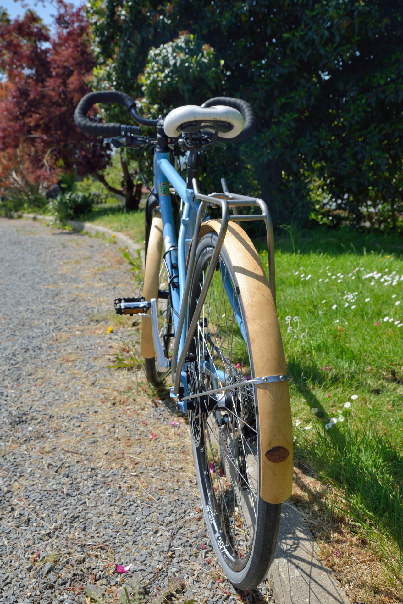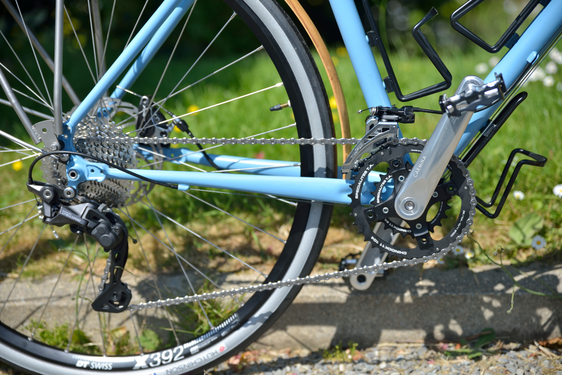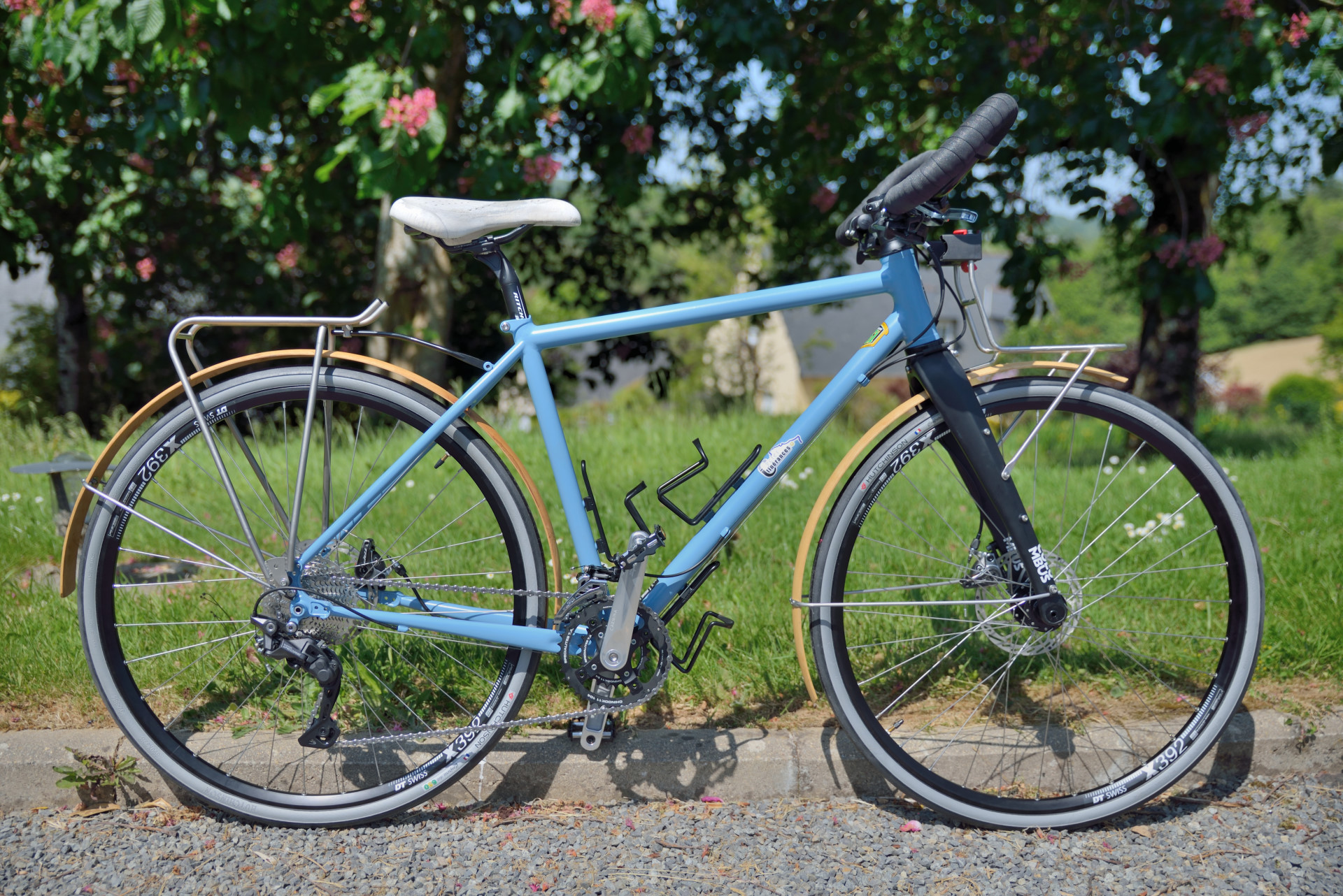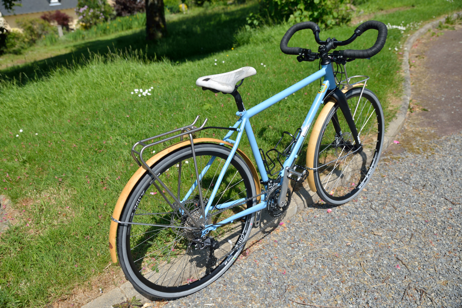 Cadre en Reynolds 631, arrière en Columbus Zona et fourche gravel Columbus en carbone. Roues montée main DTswiss , pneus 650Bx32, pédalier Spécialité TA . Garde-boues en bois.