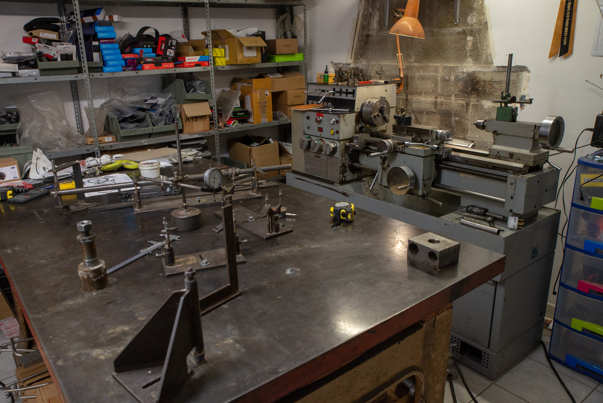 L'atelier est équipé d'un grand marbre d'ajusteur en fonte fortement nervuré de 2mx1m pouvant accueillir un cadre de tandem en entier. J'y travaille à plat pour le positionnement des tubes et le "pointage", il sert aussi au contrôle et redressage des cadres si nécessaire.