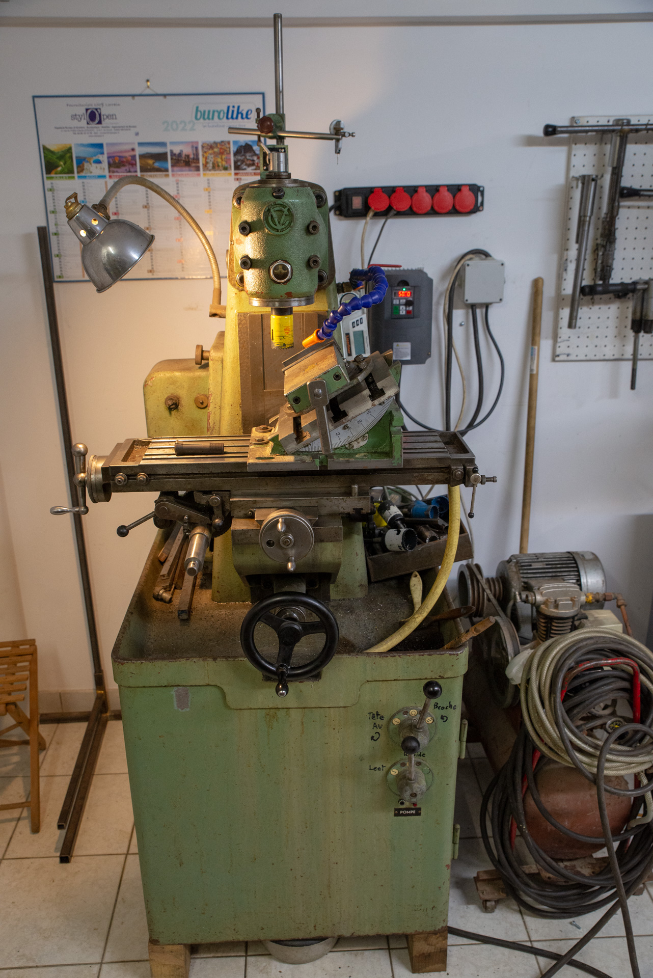 L'atelier de Mortain est alimenté en 230V monophasé et j'alimente donc le tour, la fraiseuse et un compresseur d'air avec un seul convertisseur de fréquence 230V mono vers 400V triphasé de 5,5Kw. Les commandes marche/arrêt/inversion de sens des 2 machines agissent directement sur le convertisseur de fréquence qui alimente les moteurs de broches, les pompes et accessoires ont été passés en 230V monophasé.