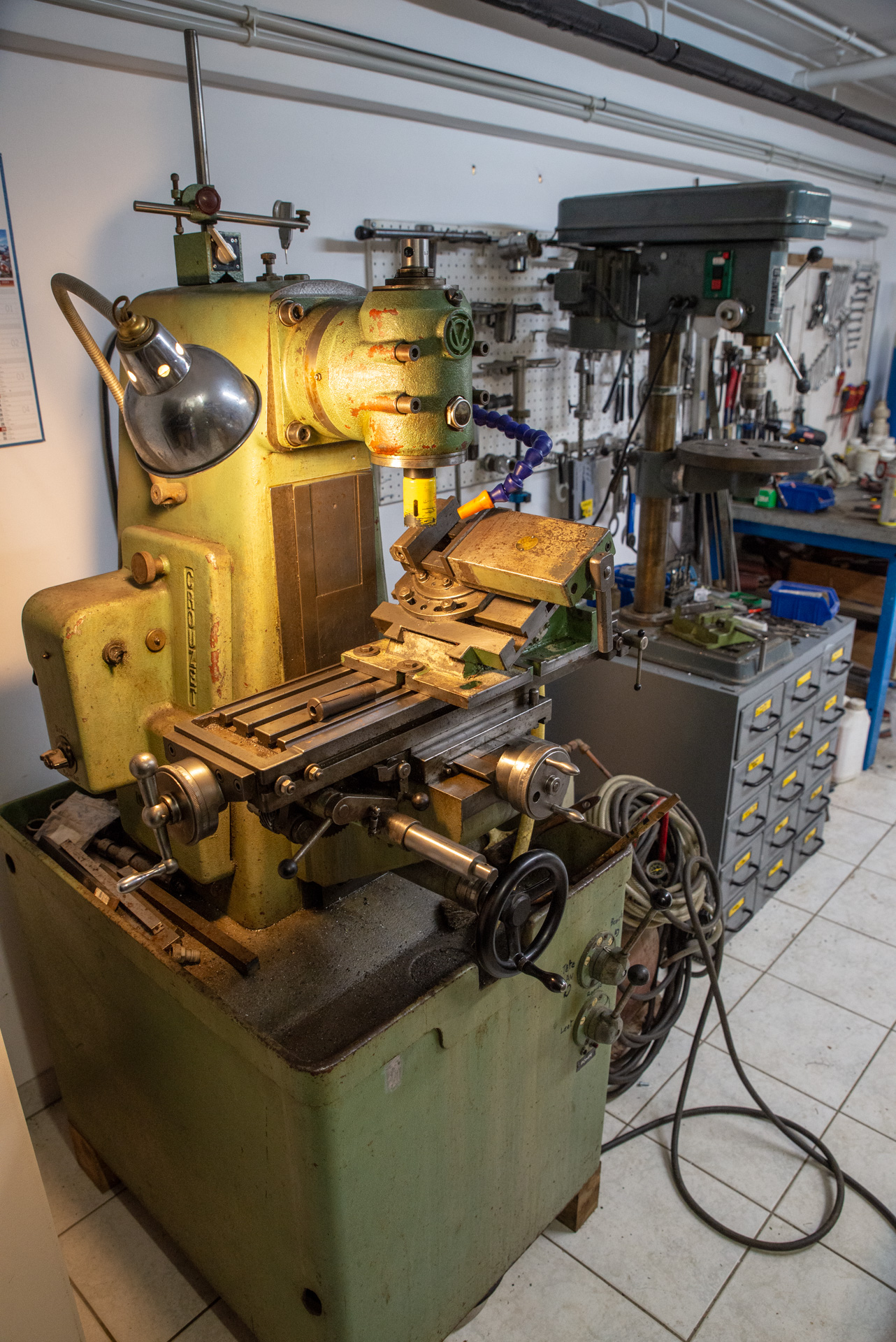 Je me suis longtemps servi de mon tour Précis comme une "grugeuse", les tubes fixés sur le chariot supérieur et les fraises serrées dans le mandrin. En 2019 je me suis équipé d'une petite fraiseuse Crouzet achetée d'occasion et fabriquée en France à Valence aux alentours de 1965. Elle me sert à présent pour "gruger" tous les tubes de cadres. Elle me sert aussi à fabriquer des outillages comme un gabarit pour les fourches ou à améliorer ceux en place.