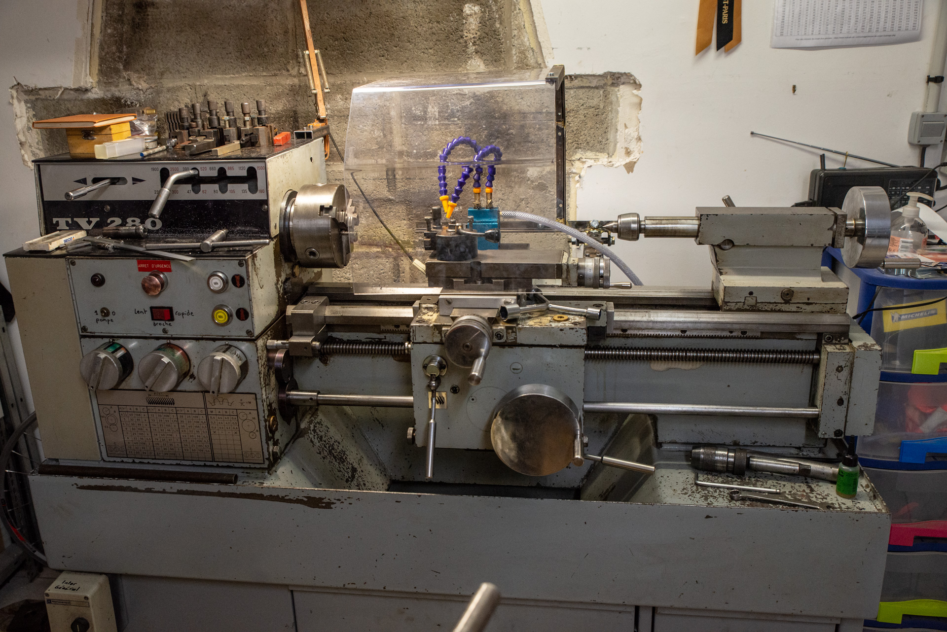 Un tour Vernier TV280 d'occasion est arrivé en mai 2024, plus gros, plus puissant et plus complet en outillage il va me permettre, outre la reprise habituelle de pièces pour les cadres de vélos, de fabriquer de l'outillage de cadreur à destination de mes confrères ou d'amateurs avertis désirant s'équiper. Il date probablement des années 1970 et a été fabriqué en France du coté de Nice, vu son bon état et le peu d'usure, il a sûrement dû passer sa jeunesse dans un lycée technique de l'éducation nationale et non pas en production intensive.